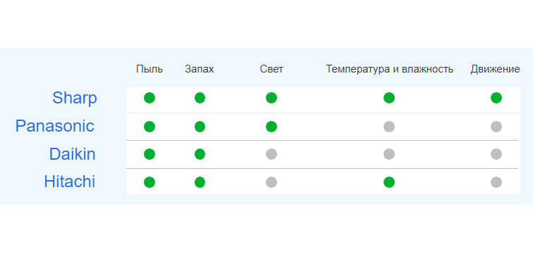 Еще одним важным показателем для японских климатических комплексов является наличие датчиков. Мы собрали информацию в единую таблицу, чтобы наглядно представить данную информацию и сравнить.
