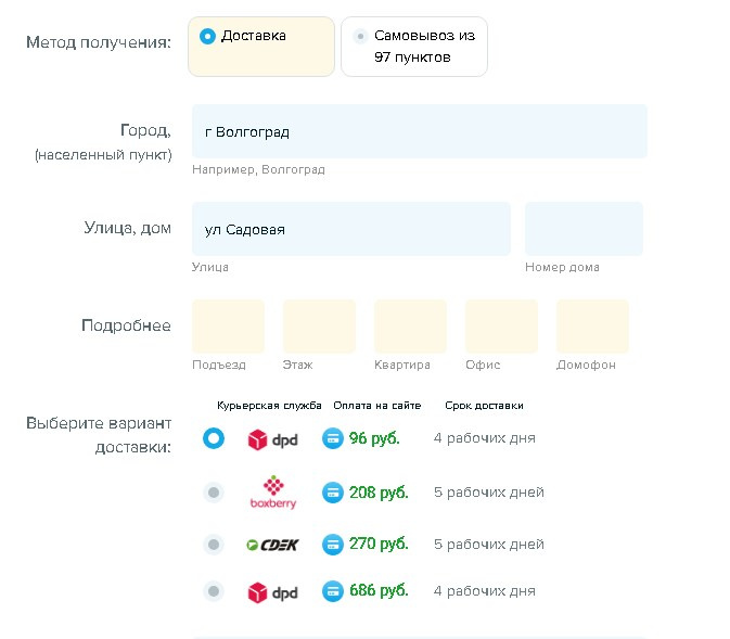 Доставка предполагает получение заказа из рук в руки. Нажмите на кнопку Доставка и выберете адрес из списка адресов - Корзина автоматически рассчитает сумму доставки. Вам останется лишь определиться с вариантом, подходящим по срокам и стоимости.