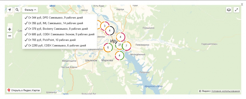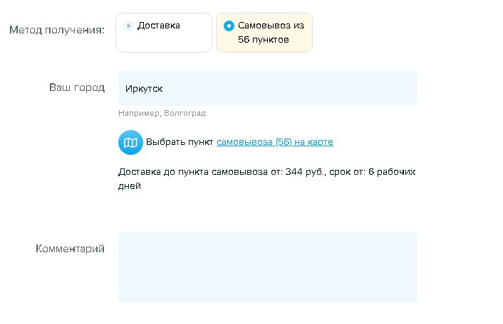 Самовывозом из пункта временного размещения удобно воспользоваться, если Вы хотите получить товар в выходной или праздничный день, а также в любой другой день в удобное для Вас время. Если Вы выберете в Корзине способ доставки Самовывоз, то система предложит список возможных пунктов самовывоза. Карту с пунктами самовывоза можно найти в шапке сайта, в разделе доставка и в корзине при оформлении заказа.