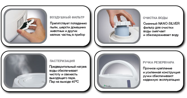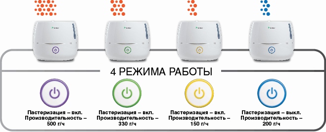 Отличительной особенностью данного увлажнителя является функция антибактериальной защиты воды - увлажнитель может нагревать и пастеризовать воду. Благодаря встроенному нагреву воды прибор способен работать в режиме горячего пара, что особенно полезно для слизистых оболочек людей, находящихся в комнате с увлажнителем. При пастеризации вода доводится до температуры 80˚С, при которой полностью погибают все вредоносные микроорганизмы - бактерии и вирусы. Прибор способен работать в четырех режимах - пастеризация при высоком, среднем и низком испарении и с выключенной пастеризацией при испарении 200 грамм воды в час. Все четыре режима легко переключаются при помощи единственной кнопки - Power. При переключении меняется цветовая индикация - доступны четыре цвета (фиолетовый, зеленый, желтый и синий). Бак для воды имеет удобную ручку для переноски, а также поворотный диспенсер пара.